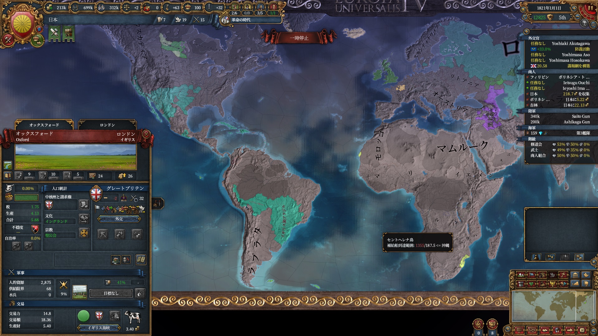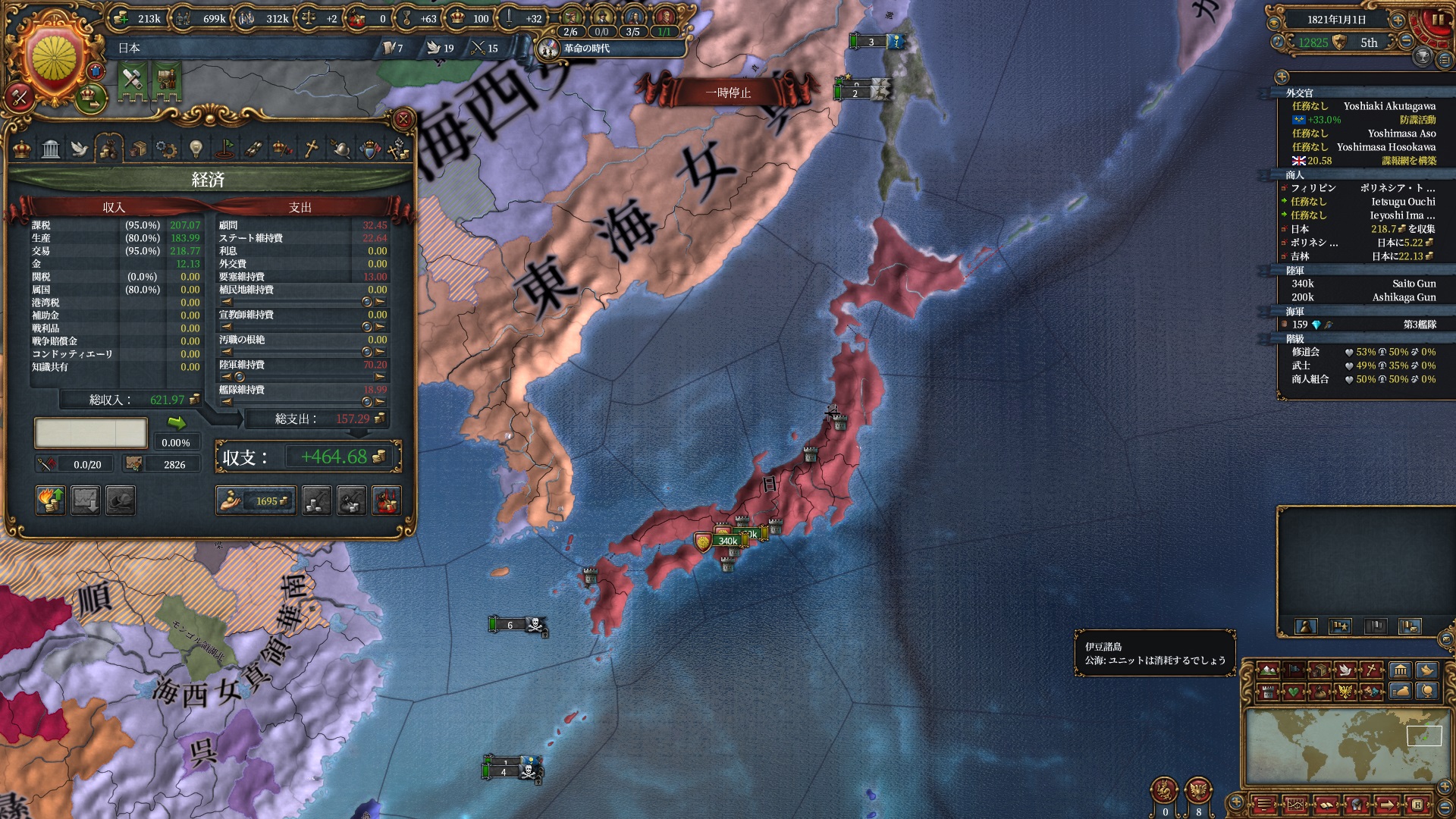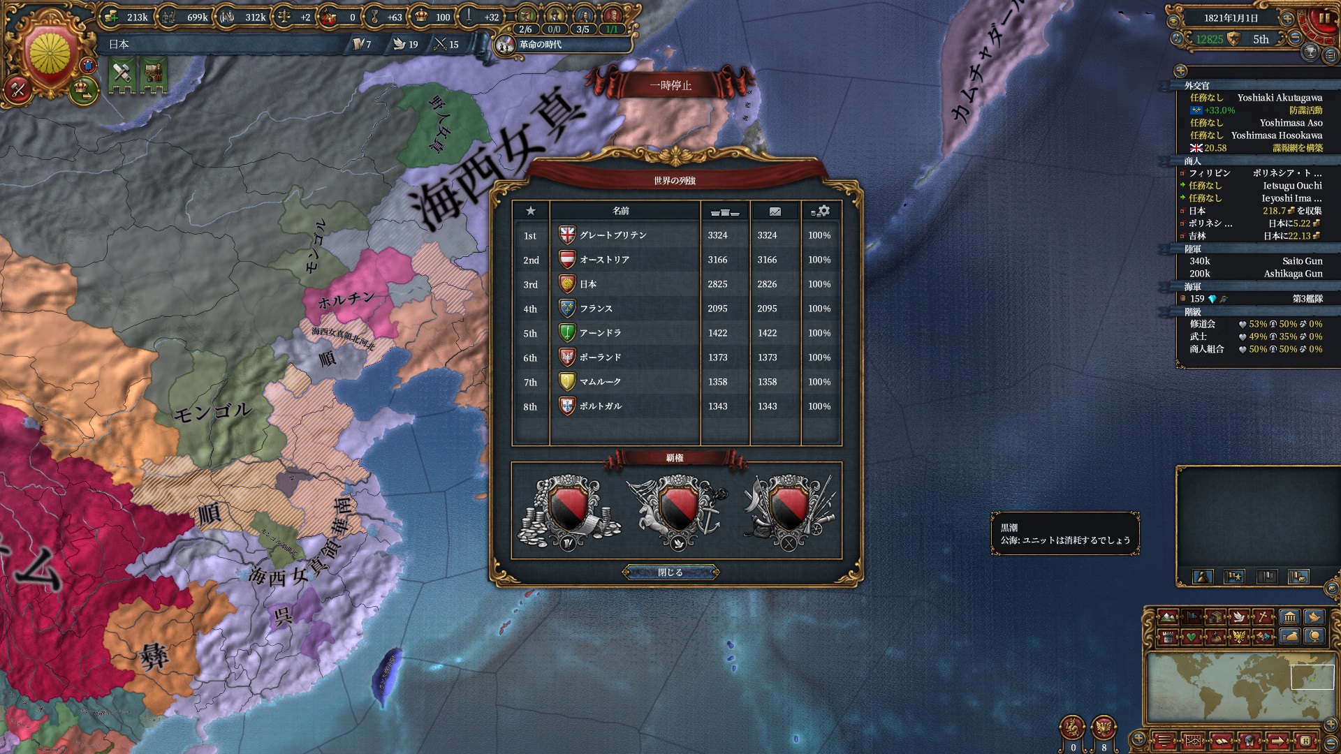 交易力の計算では州のdev値も直結するため日本の交易力は極めて高くほぼ独占状態。最後交易保護艦隊は吉林の保護で無理矢理富を吸いだしてました。