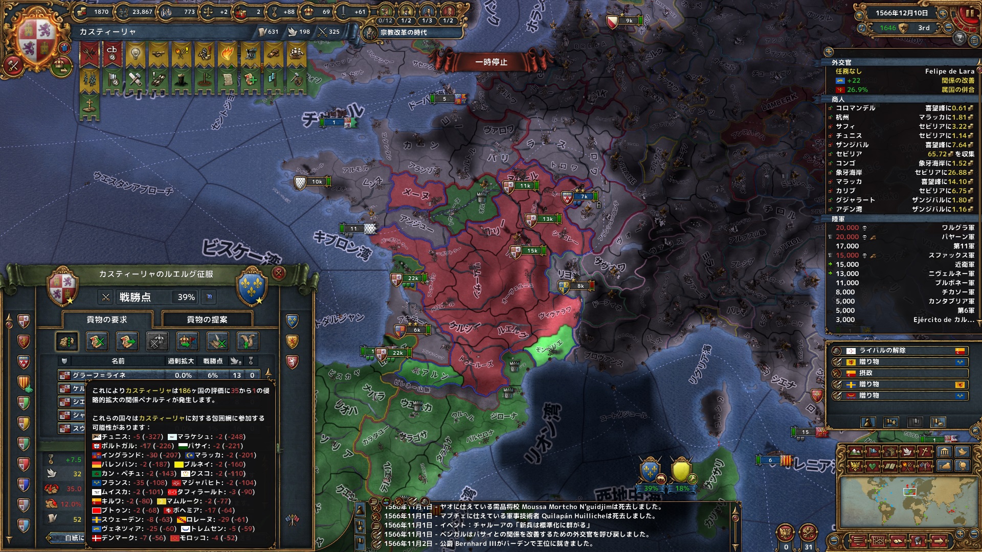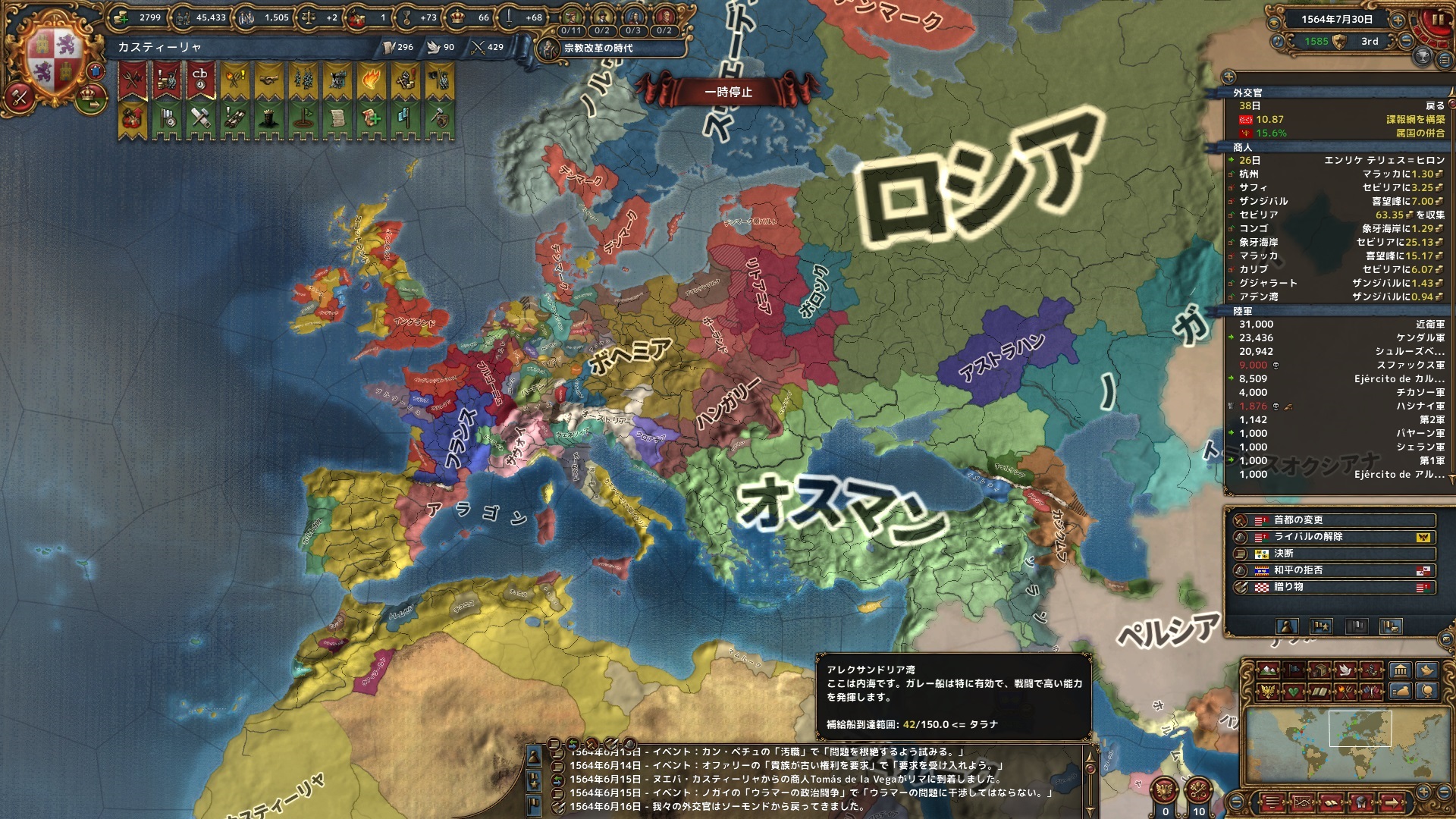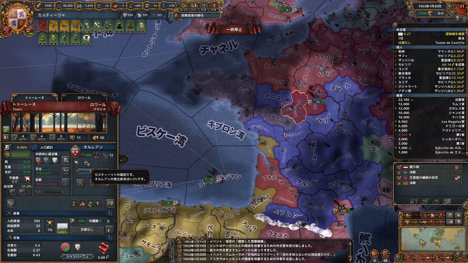 1月 オルレアンを外交属国化。西ヨーロッパではAEの上がり方がとんでもないと分かり、可能な限り外交的に拡大することを試みる。再征服の利用についても集団を講じ始める