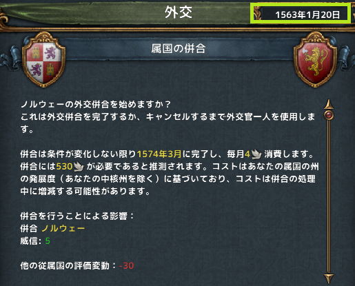 9月、オルレアンの併合を開始。ノルウェーの併合に時期を合わせ、効率的に外交枠を空けたい。