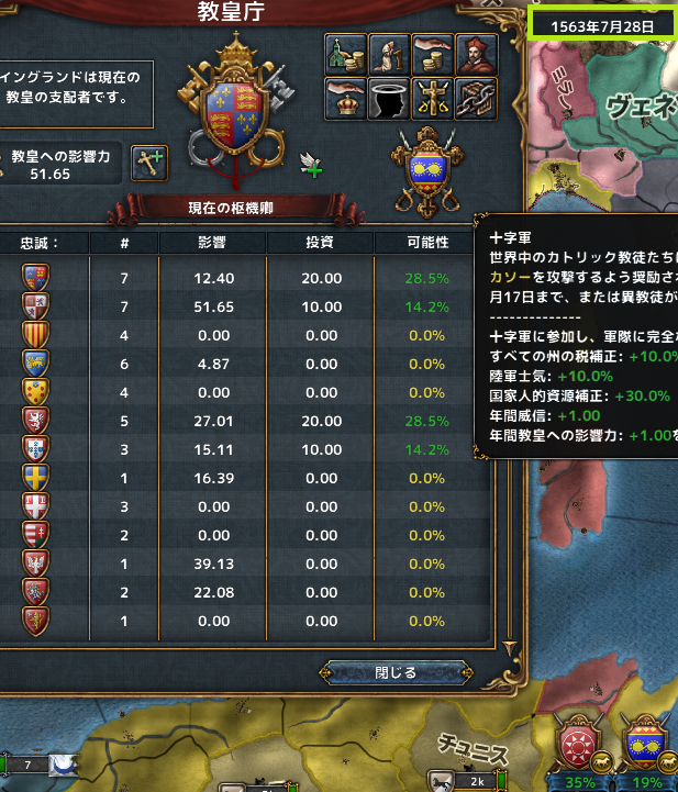 この後、何故か教皇支配者のイングランドがチカソーに対して十字軍を指定したので、我々にも十字軍の恩恵が得られることに。