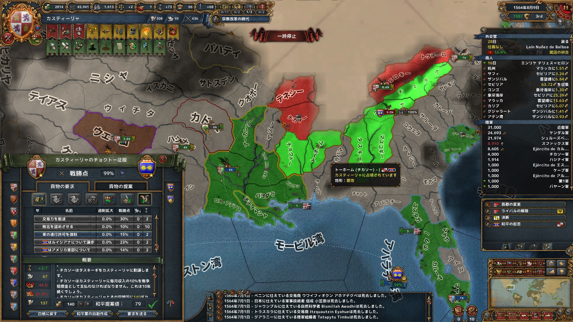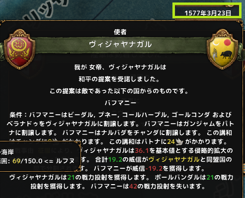 同月、裏でやっていたムイスカ戦は、進捗が悪く白紙和平とした。平和期間確保のために。