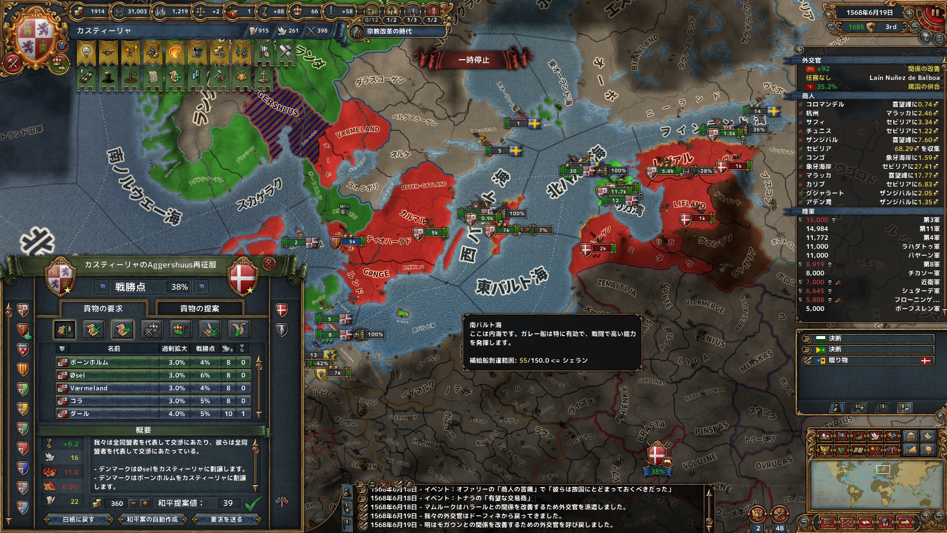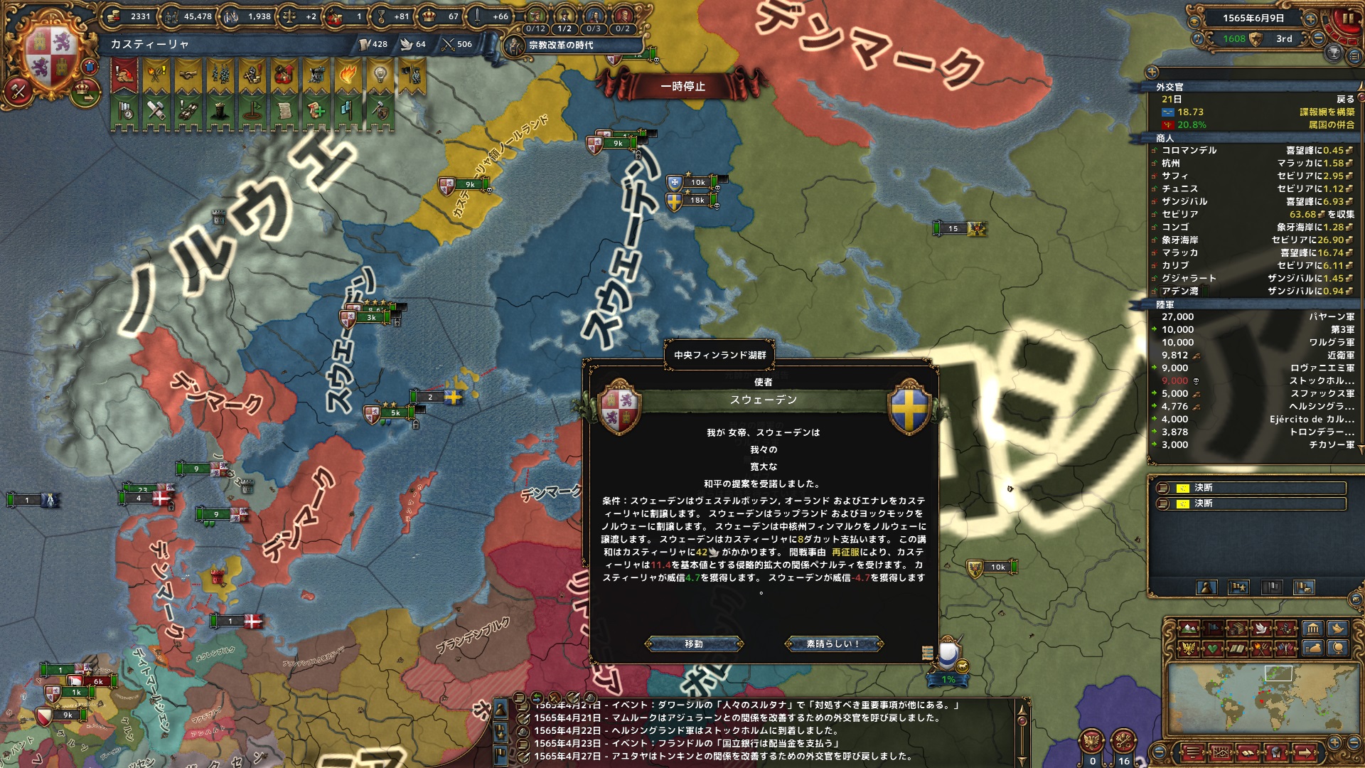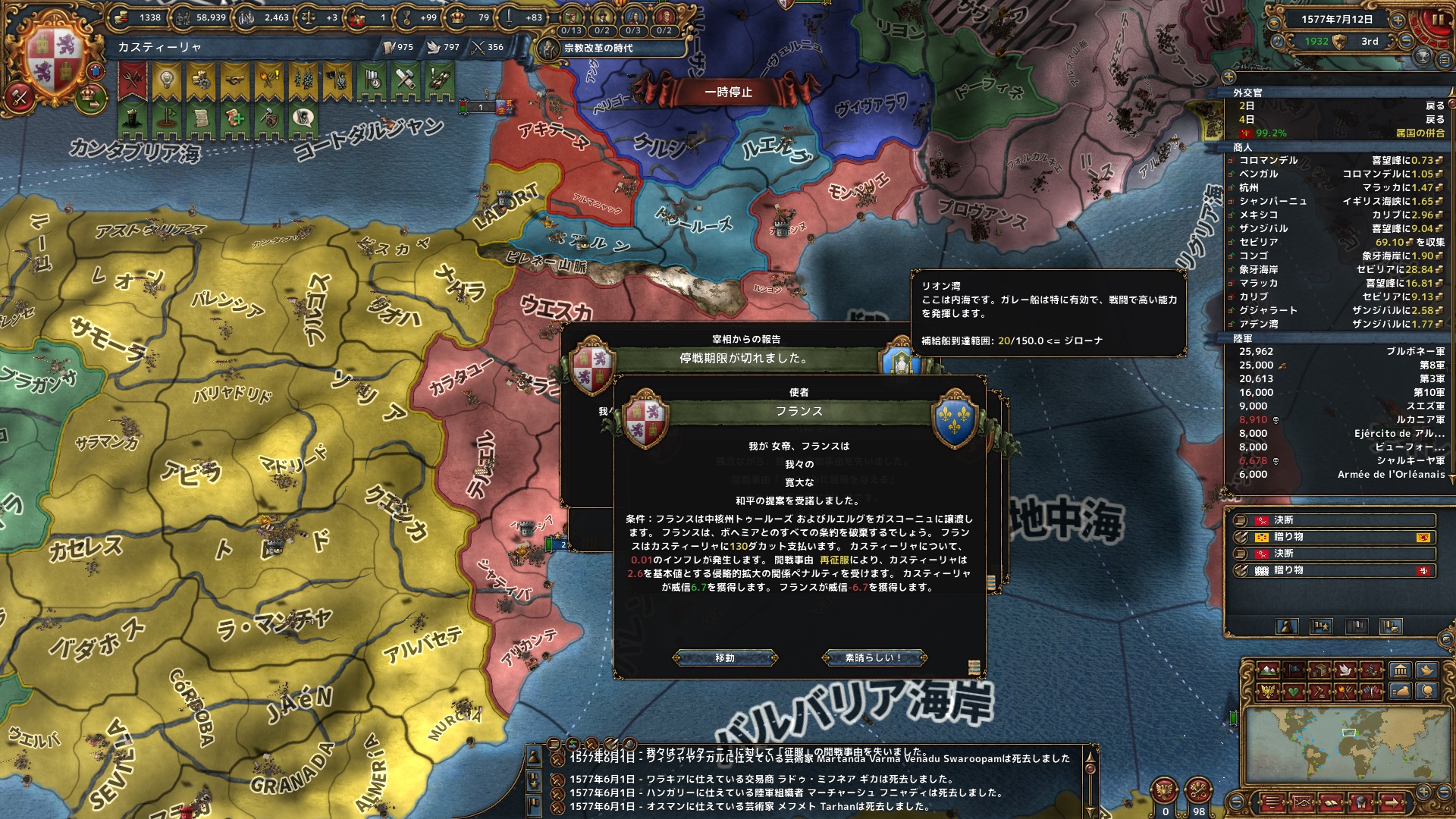 計8州を奪って停戦。Devの高いアレクサンドリアと周辺の州をアラゴンに取らせ、カスティリャは紅海沿岸とペルシャ湾に支配地を獲得した。