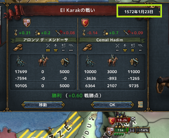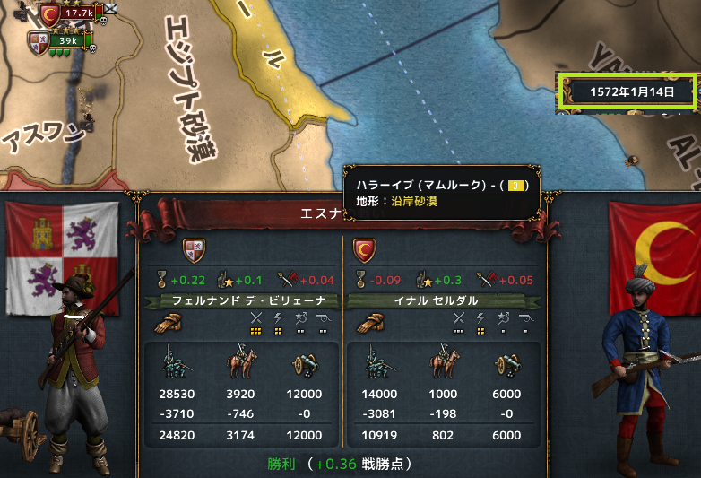 マムルーク領に2万で入ったオスマン軍を倍兵力で捕捉したのに、被害はこちらの方が多くてその上撤退されてしまう…。