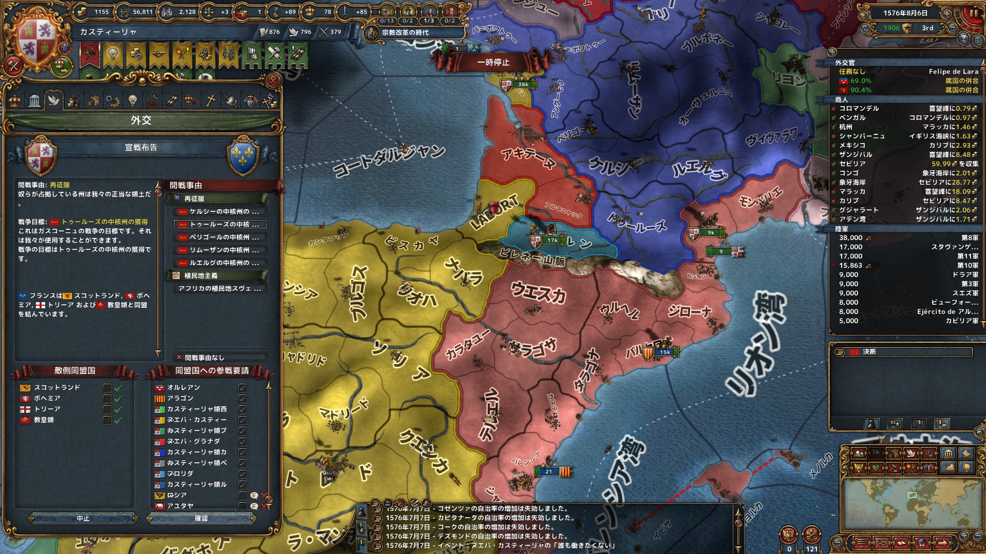 従属国は入れ替わった結果、ガスコーニュ(属国)、アラゴン(同君連合)、海外植民地となる。同盟国はロシア、アユタヤで動かず。
