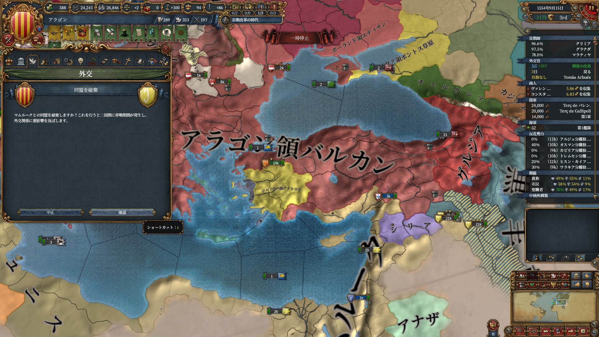 マムルークは包囲網対策としては優れているのためシリア返還させつつ同盟継続していますが、交易の収入にも大きく関わる地域の為いつ頃切るか悩んでいる今日この頃。