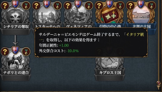 外交併合コスト-10%を得られるミッションはサヴォイ地域の統一→ジェノヴァ征服→サルデーニャ島征服→シチリア島征服→ナポリ征服と続くツリーですが後半はアラゴンなら初期から達成済の領地であり簡単に恩恵を受ける事が出来ます。