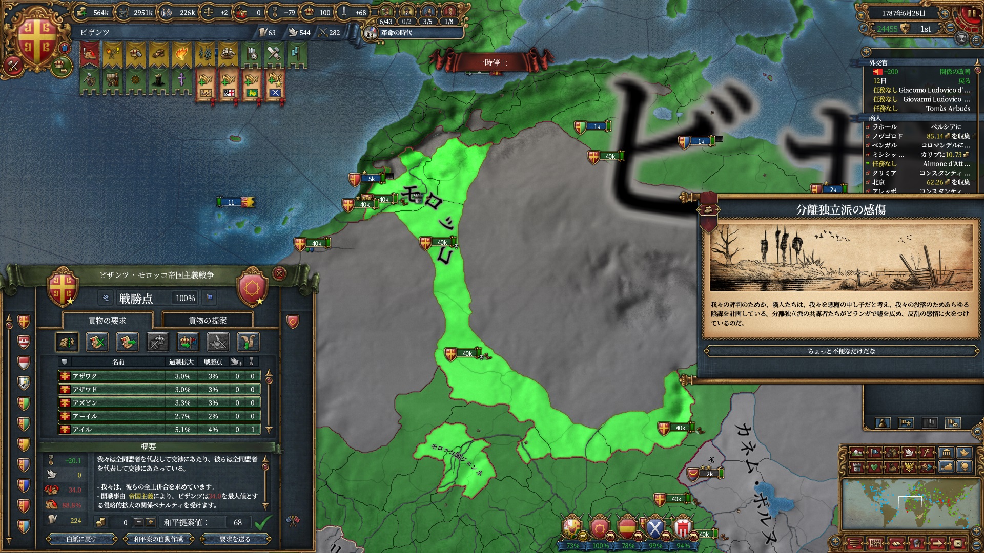 今回サルデーニャ→ビザンツとシフトする事で布教強度を爆発させ自力でもかなりの改宗が行えていましたが結局ギリギリになってしまい、どうしてもOFは属国をもっと駆使しないとなあと思うばかりです。