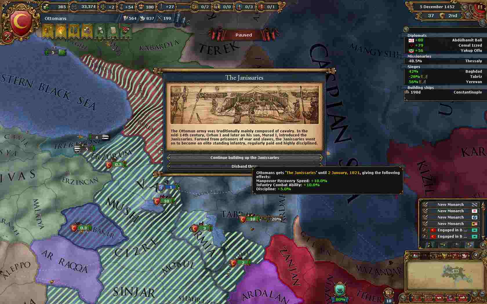 ここまでの戦争はオスマンの物量から、圧倒的な勝利が出来ましたが今度はそうはいきません。戦争疲弊の回復を待ち傭兵をリミット上限以上に雇い準備万端にて宣戦。