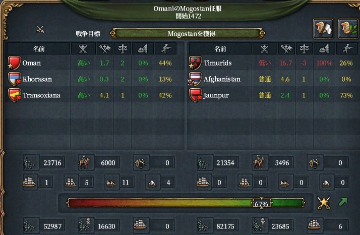 1472年、Timuridsとの停戦期間が明けたTransoxianaとKhorasanに土地の約束をして宣戦しました。相手同盟国のJaunpurが気になりますが、主戦場から離れているしTransoxianaが被害担当になってくれるはずなので大丈夫!