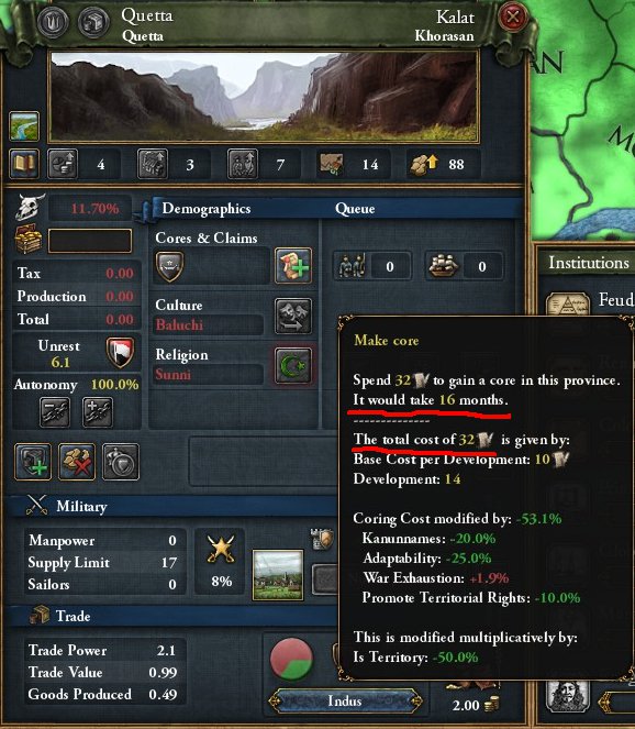開発度14のプロヴィンスをこの時期に32ADMでコア化できるのは、オスマンを始めとしたコア化減が国家アイディアにある国ならではですね(コプトの貢献は7点分)。