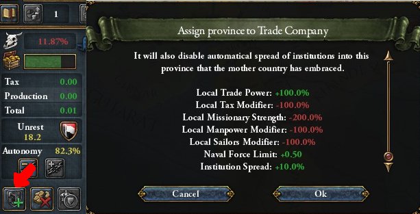 なお、Religious Zeal によりしばらく改宗できないプロヴィンスについては、ペナルティが消える時期がかなり先なら一度貿易会社に割り当て、ペナルティ消失後に割当てを外して改宗します。