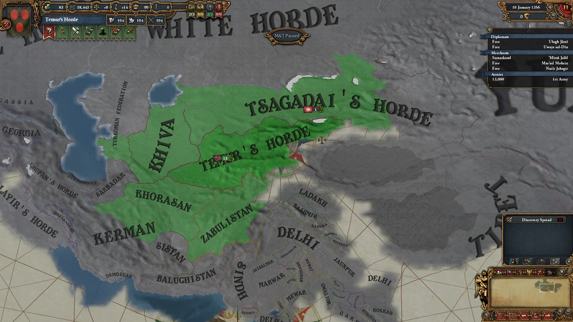ミッションでヒヴァのプロビを獲得するやつを選択し、ヒヴァにReconquestのCBで宣戦布告。ザブリスタンが敵側で同盟参戦してきたが、なんのその、ホラサン戦と同じ要領でヒヴァを全土占領し、これを併合することによって強制的に戦争を終わらせた。1360年のことである。