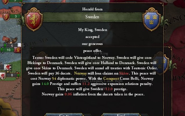 他にホルシュタインの属国関係解除、リトアニア、モスクワとの関係断絶、小額の賠償金を受け取って講和成立。休戦期間が過ぎ次第ホルシュタインは食いに行く心算。