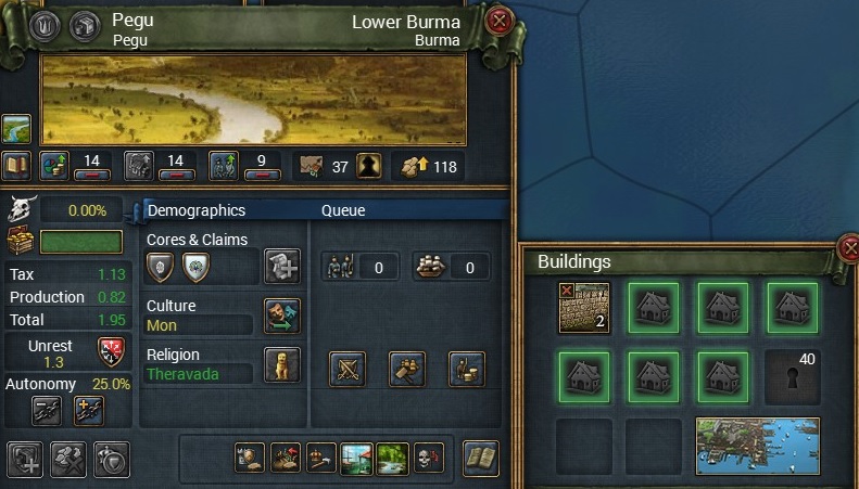 交易中心地であるPeguを手に入れたTaunguは国力増強と収入増大を目指し、Peguの開発を進めます。