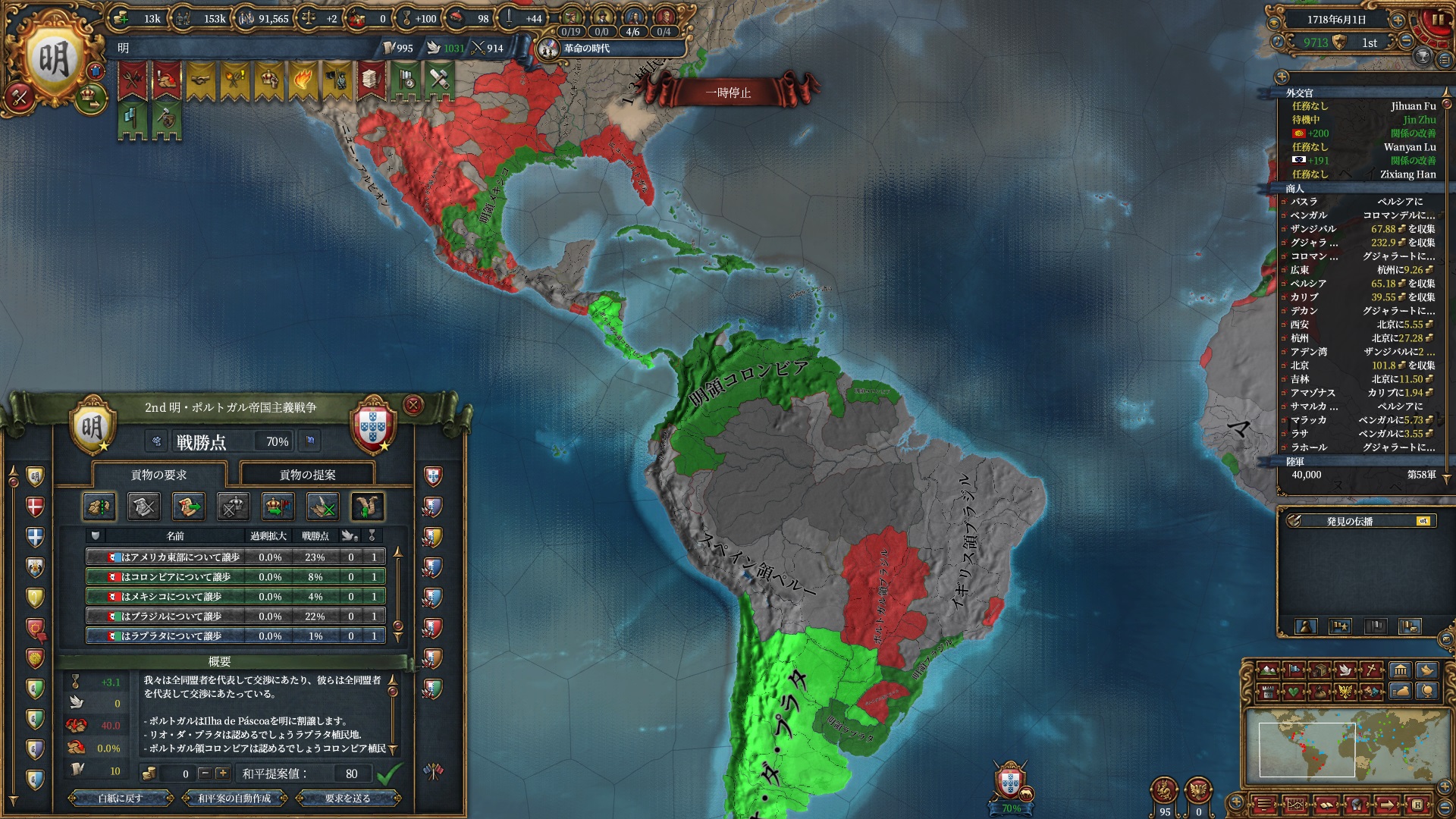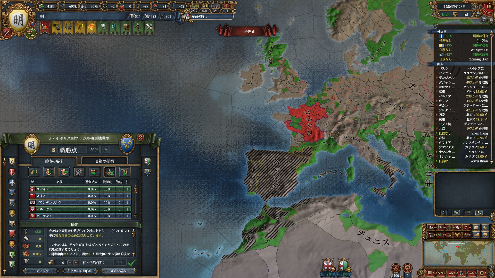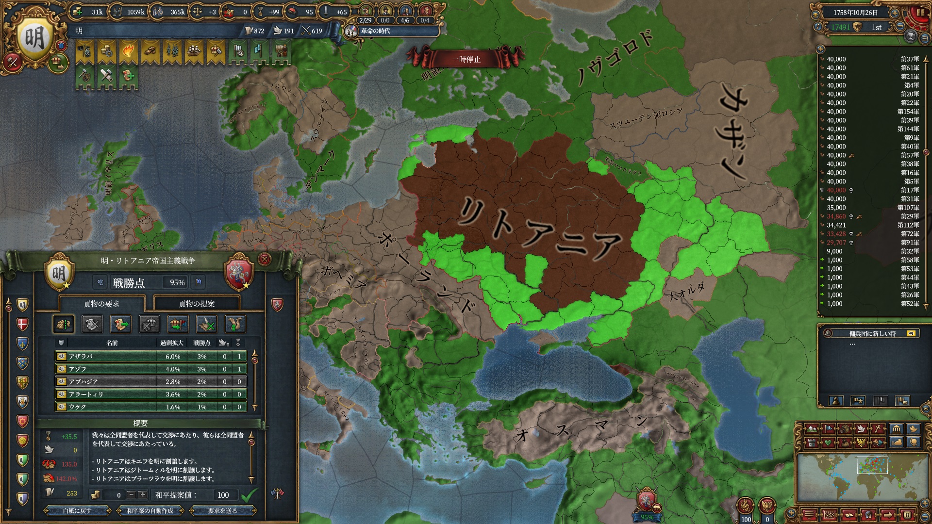 全州取得に必要な戦勝点は100を超えていますが帝国主義CBで75%の領地割譲と組み合わせれば(AEは無視するとして)属国に出来そうです。