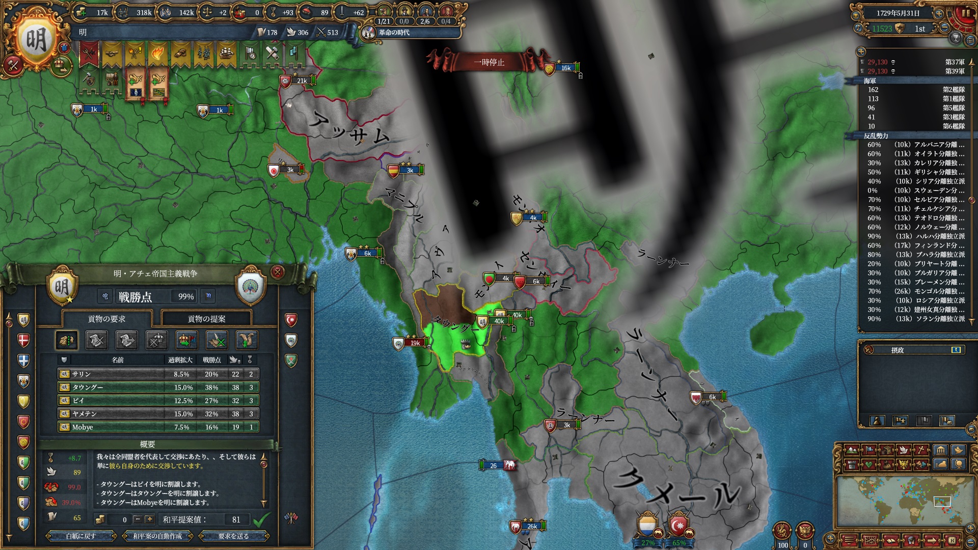 次はオスマンに行く予定なのでアチェと同盟しているラーンナーに仕掛け、同盟破棄させました。