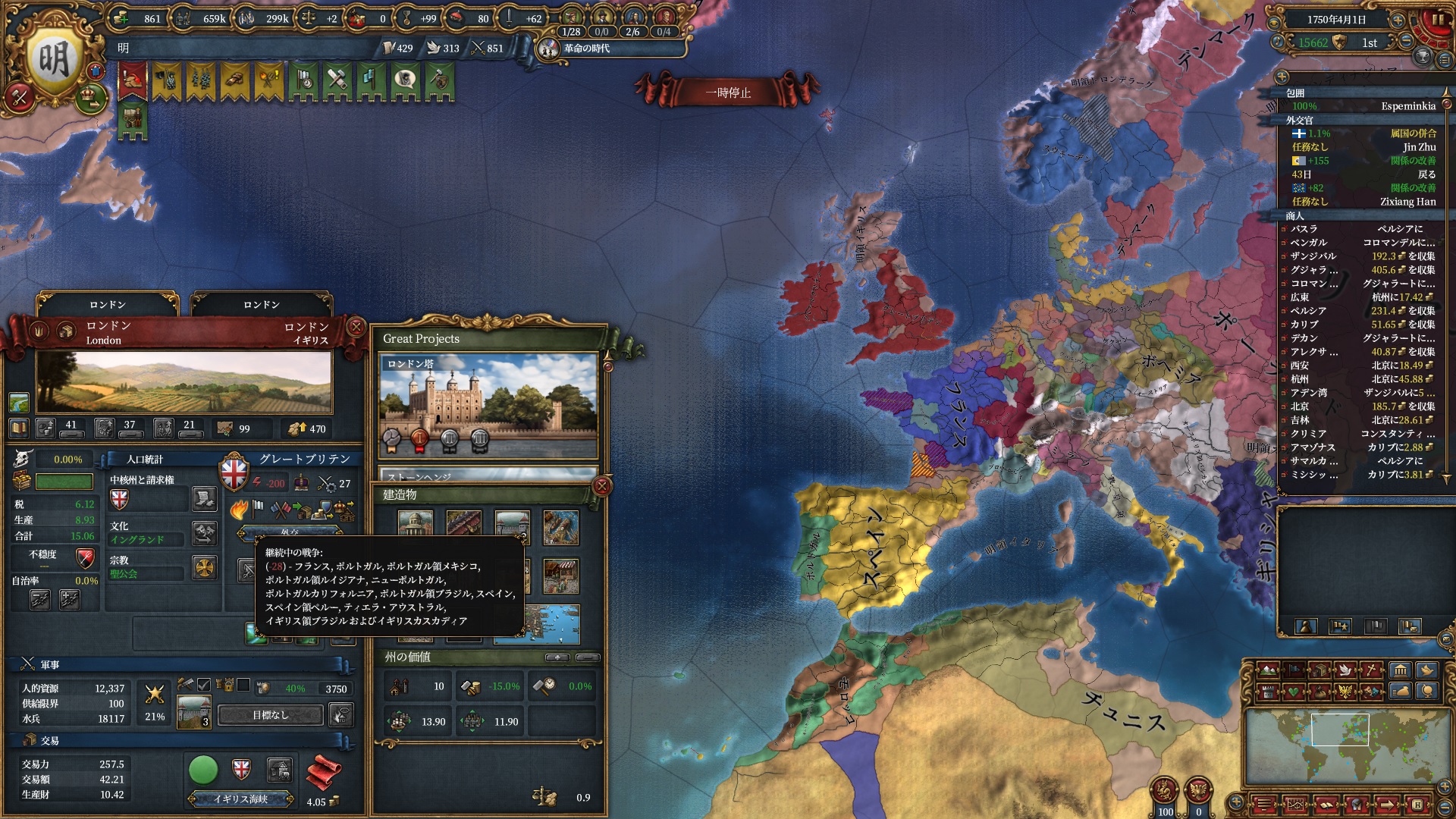 持っている植民地はカナダ・ルイジアナで1.31の北米原住民追加の影響を大きく受けており、OEがかなり高めになっています。