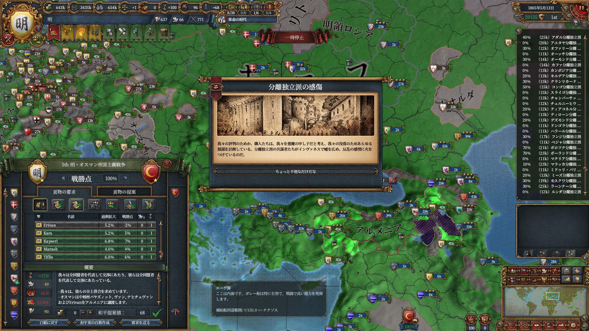 今回の世界線としてはイギリスが伸びたのと対オスマンで苦心した反面他の列強国が軒並み成長に難を抱えており、この2国を抑えた後の残りの掃除が楽になりがちな世界線となっていました。
