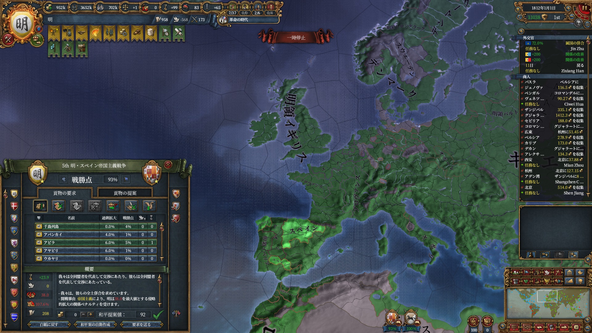 スペインと争っており画面下端に見える島などが欲しかったため宣戦し全土併合しています。