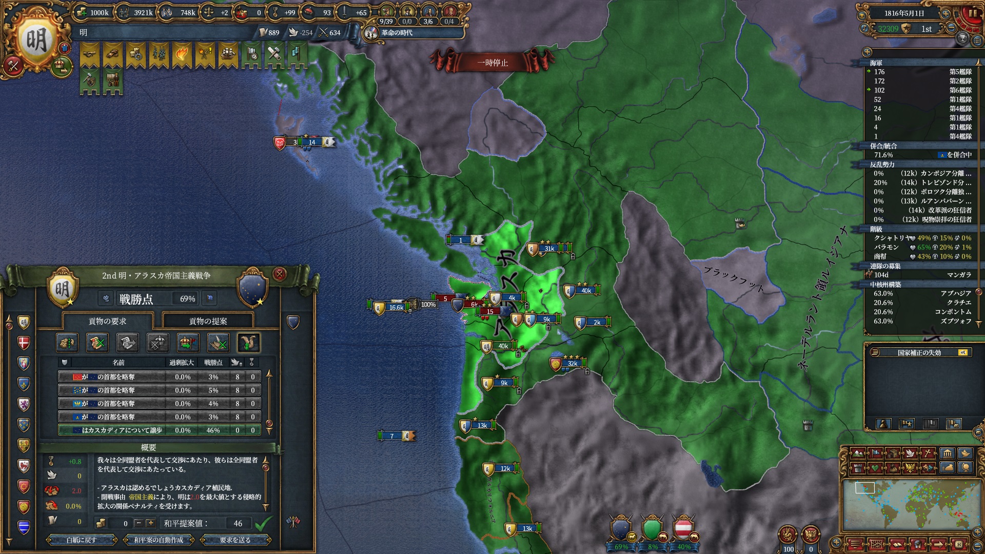 領地が削れてくれたおかげで労せずに全土併合しカナダ・北ルイジアナ・東カスカディアを手に入れました。