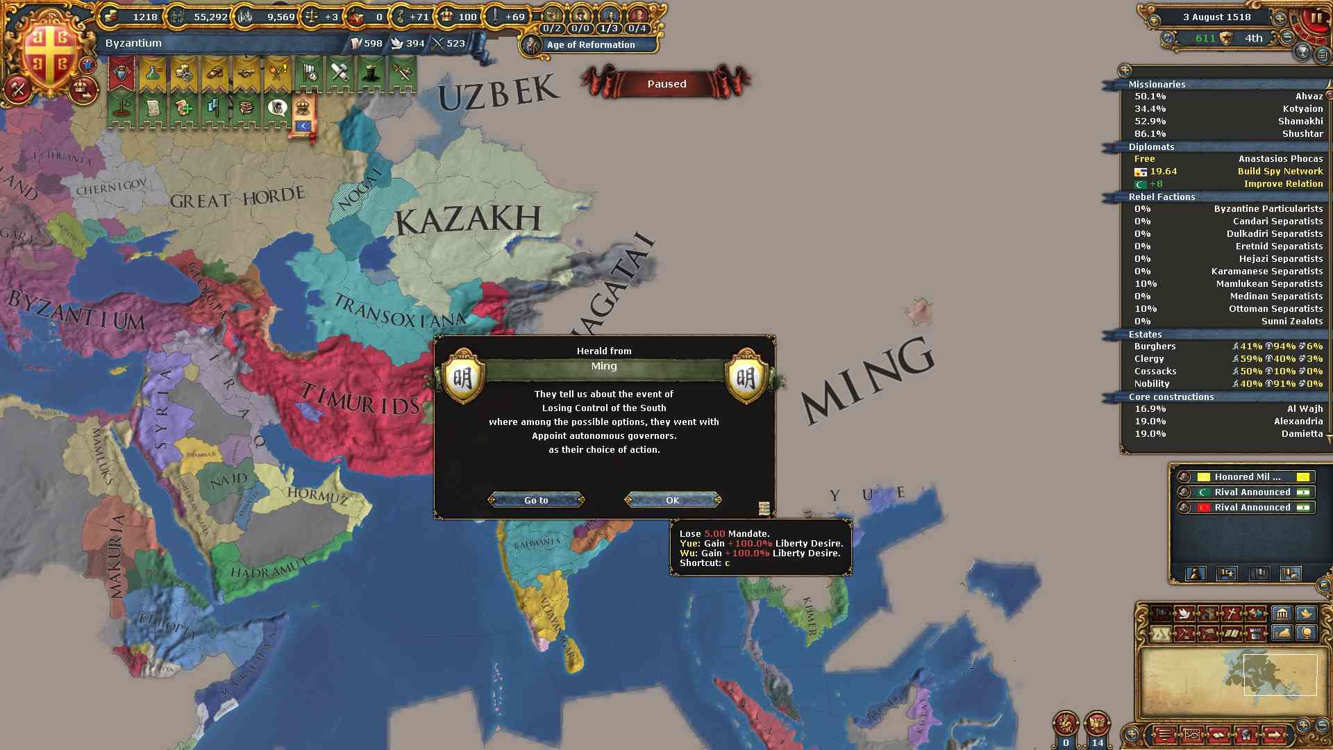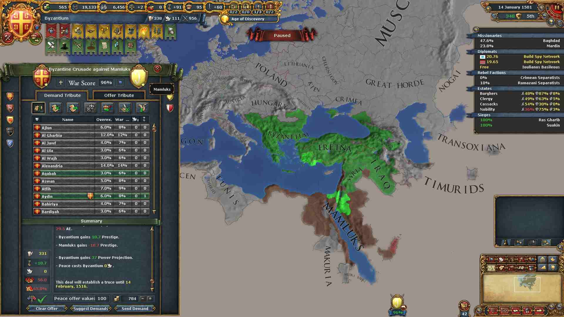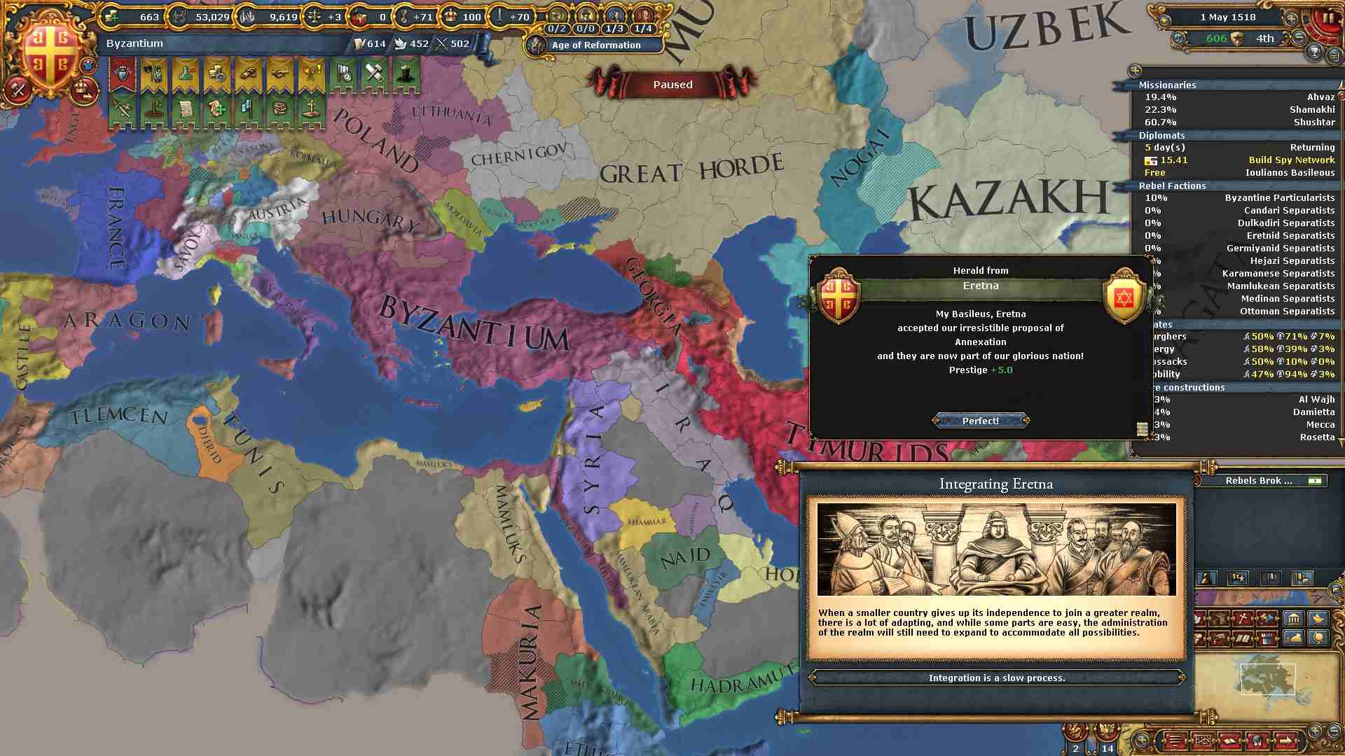 ミッションの外交併合コスト減少の効果も使い、属国エレトナの外交併合が終わりました。
