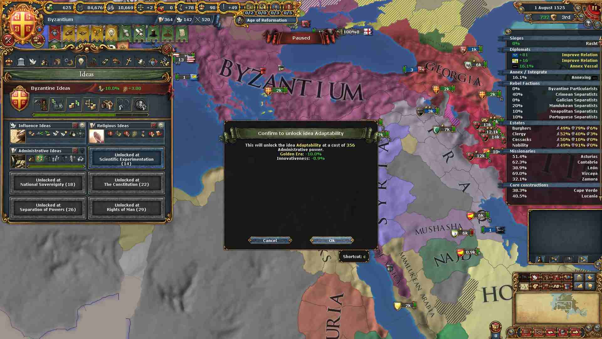 ここで統治アイデアの「コア化コスト減少」を取りました。