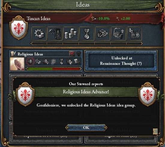 内政に強力なブーストがかかり,軍量と軍質も一応は強化される.全体としては優秀な部類だと思うのだが,唯一,伝統の教皇影響度+2/年だけが腐りやすい.立地からThe Papal Stateにライバル指定されやすく(今回もされている),友好度が-200に貼りつくせいで教皇影響度が増えなくなるし,隣接すればすぐに破門される.ドイツ諸侯が同じNIを持っていたら評価も変わったと思うのだが….