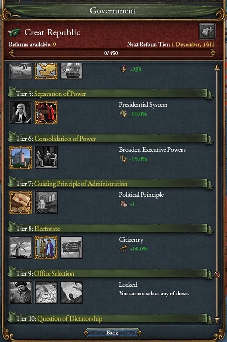 軍質が上がったり,Governing Capacity +250とテリトリー自治度下限-10 %を両方得られたり(君主制だと択一),政府改革を全部開けられるなら共和制にも独自の強みがありそうなのだが,そこに至るまでが面倒で嫌になる.