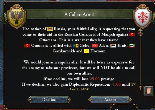 1600年,Russiaから対Ottomans戦のお誘い.ラスボスとして後に残しておくつもりだったのだが.