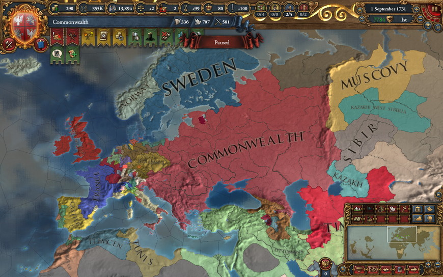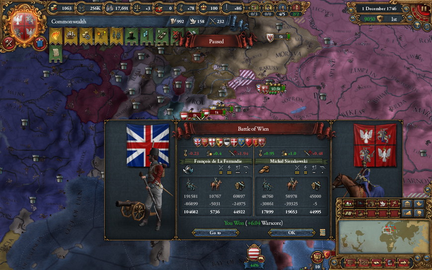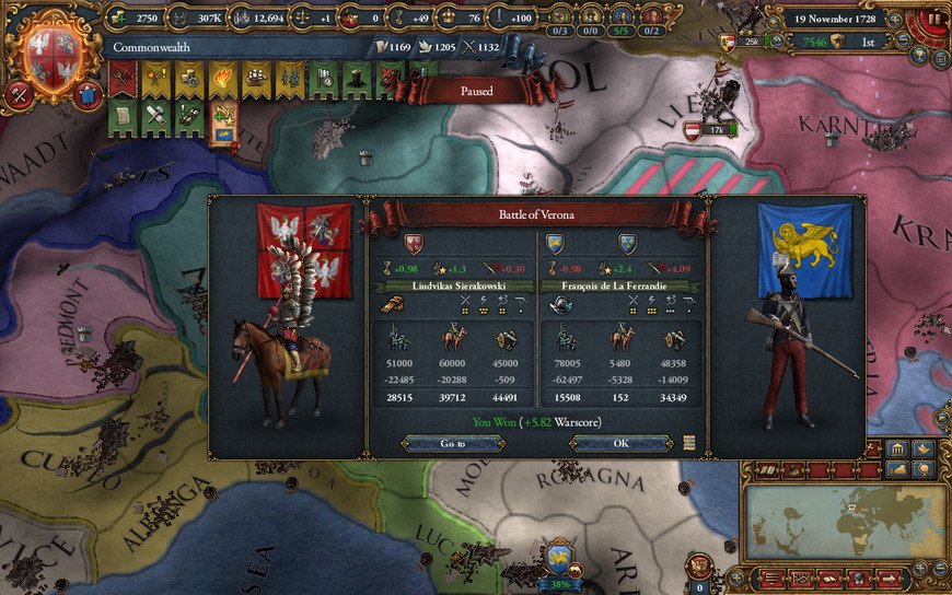 さて。こんな感じで前編の強制決戦方式を使い、敵軍の一番硬いところを粉砕し、彷徨う3万から4万ほどの小勢を接触事故で消滅させながら、七年戦い和平した。