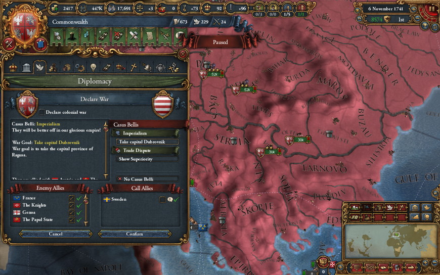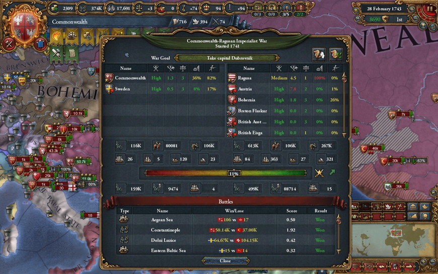 ラグサに宣戦して、参戦国にそれぞれの同盟国を招待するようチェックをすれば、対抗連合まで呼び出せて、だいたい全部釣れるのだ。