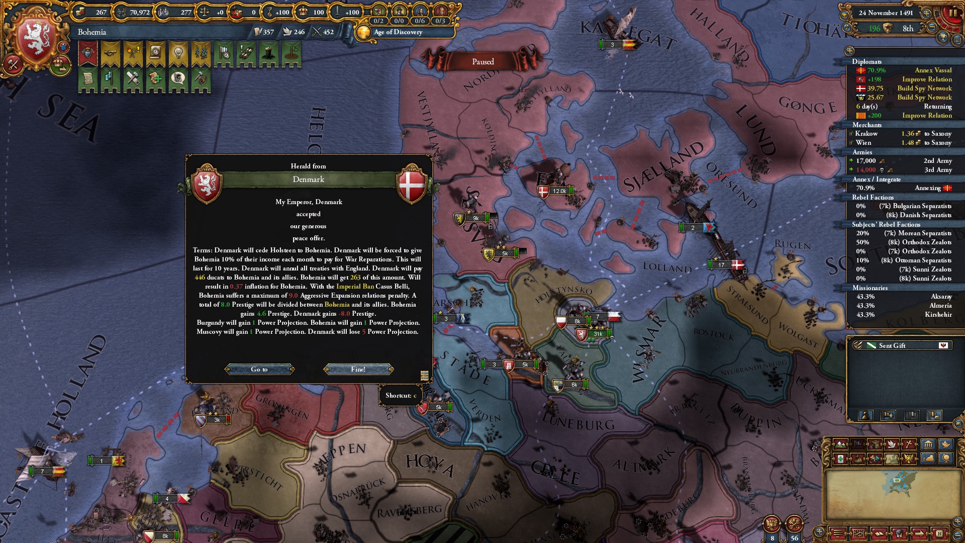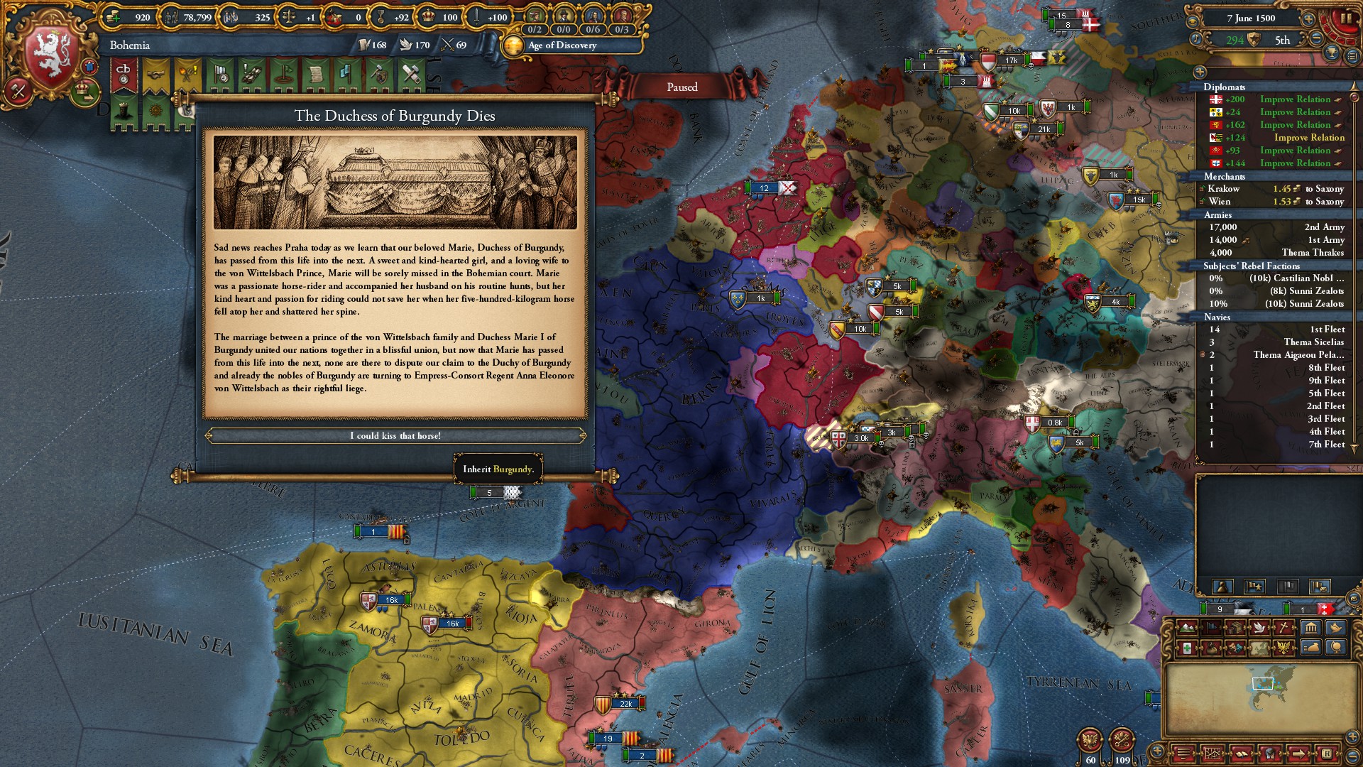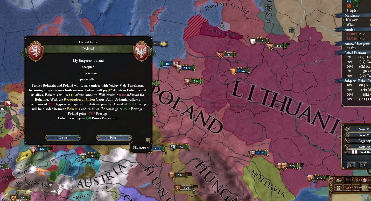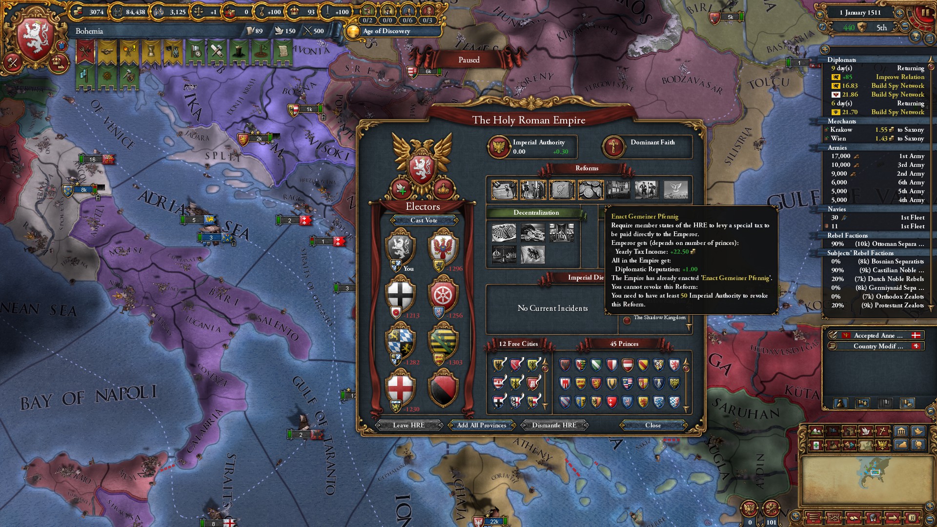 1500年に帝国の議題の4番目を通過させました。なお、イベリアやポーランドの同君化強制により、AEの蓄積のせいで数年遅れました。