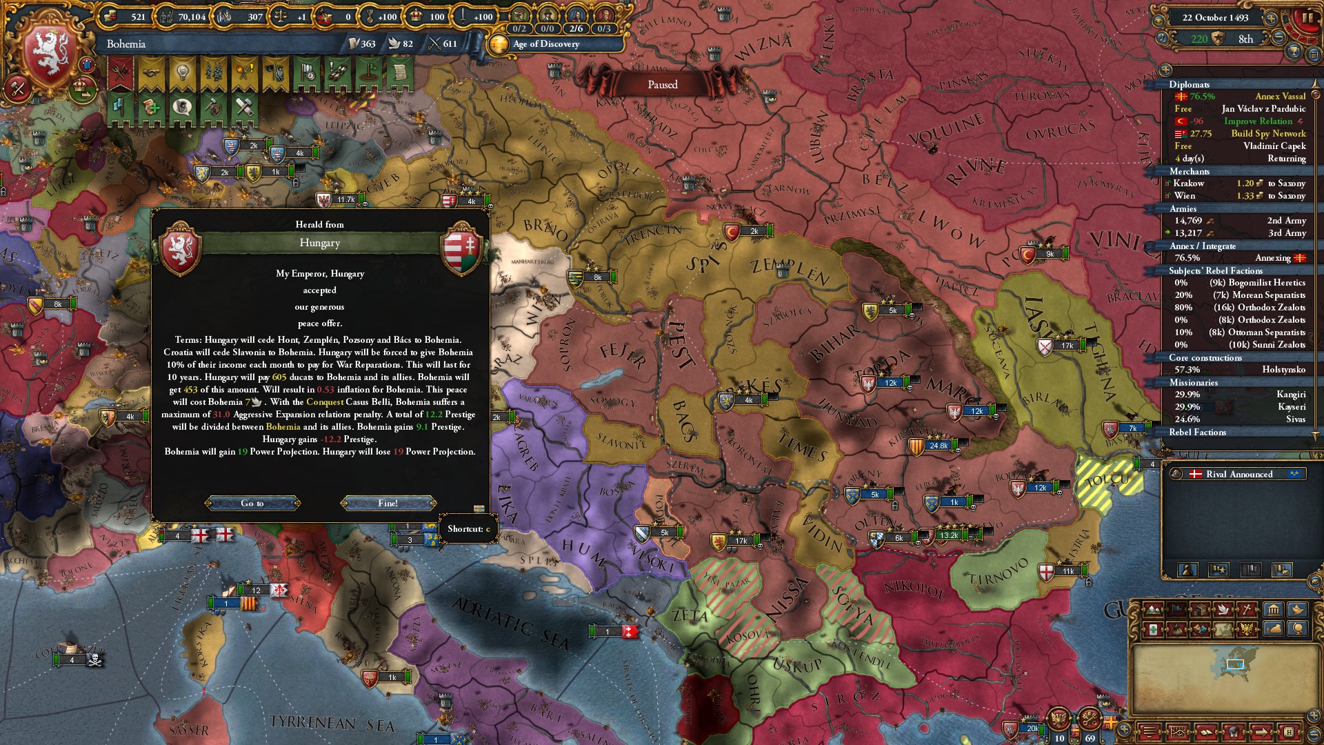 第三次ハンガリー戦終結。セルビア、オスマンから独立したブルガリア、属国解放したクロアチアに領土返還させました。また、モルダヴィアを属国から解放させました。