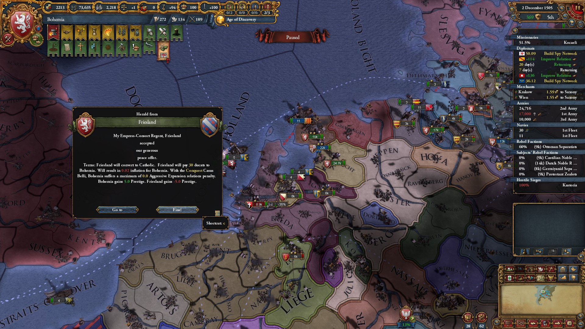 不法に帝国領を占領していたサヴォイからは、ジュネーブの独立と我が国への1プロビ割譲と賠償金で和平。この戦争中に黄金時代に突入しました。
