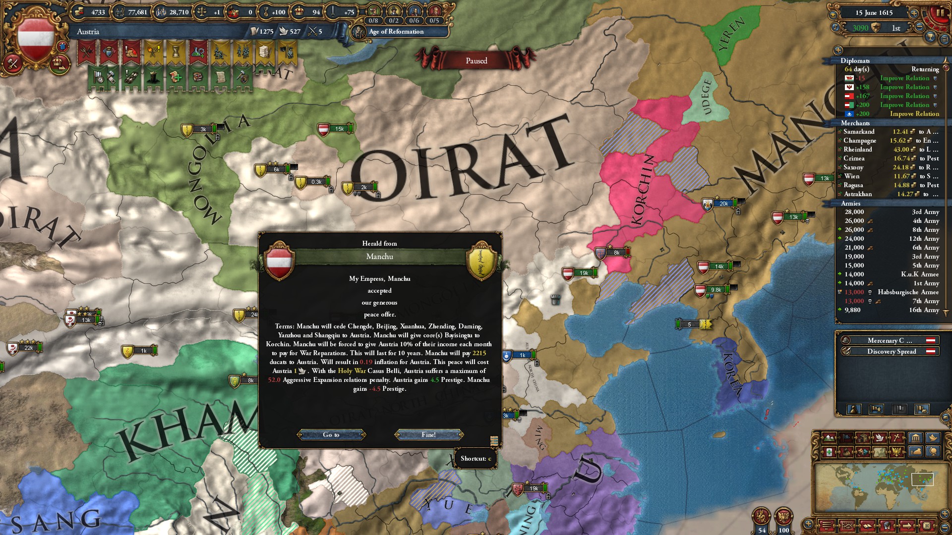 まあ、ミッション報酬、アイデア、ポリシーで外交併合コスト-70%になる予定だから問題ないわね。モンゴルは1625年に外交併合したわ。