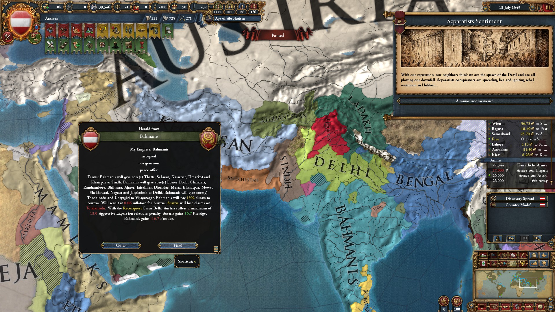 インド亜大陸の大半を収めていたバフマニーには、デリーの乾酪イベントを起こされたものの、デリーの旧領を全て返還させました。