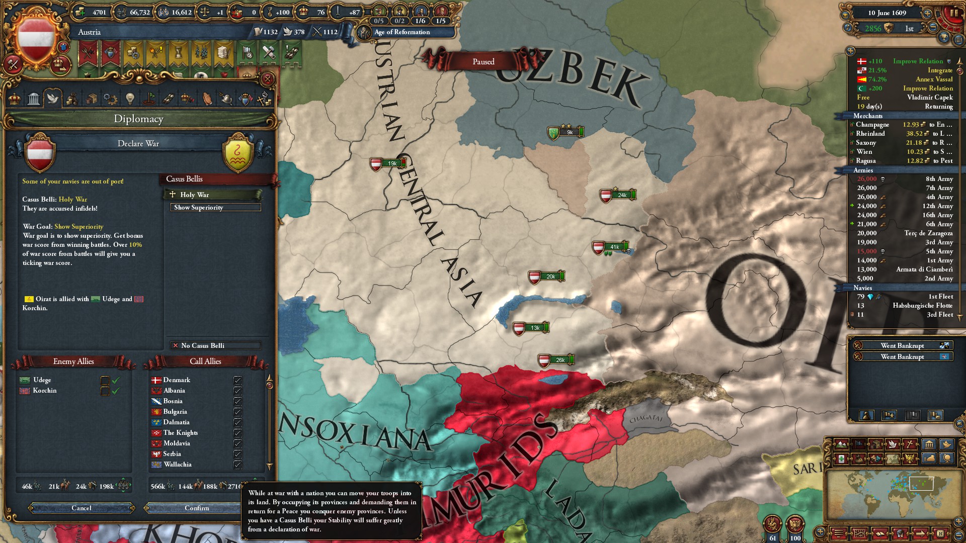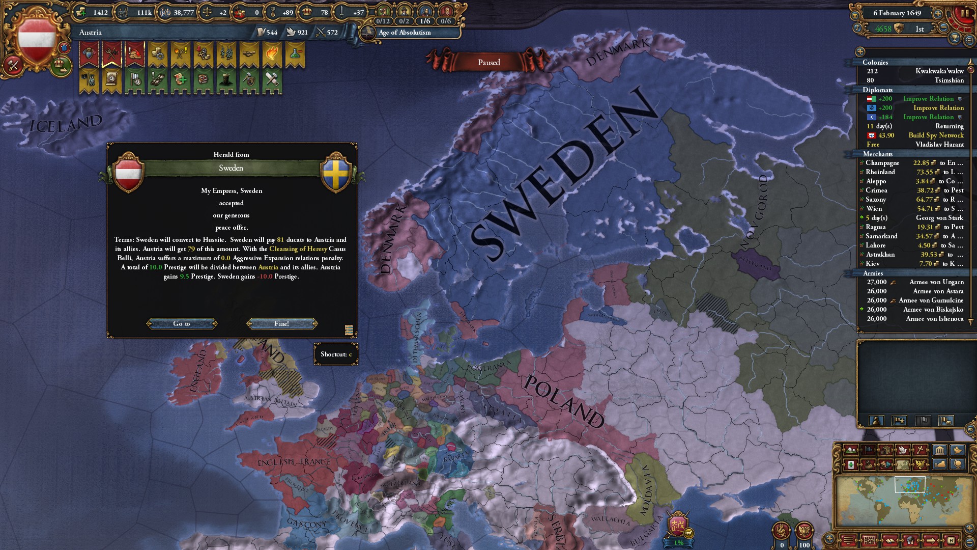 1611.4にカスティーリャ、1612.3にナポリ、1612.7にリトアニアをそれぞれパパっと外交併合したわ。これで同君下位国が減って、外交枠はだいぶ余裕ができたわ。