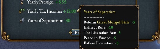 最後アイデアは攻勢は1766.12に完成したわ。正直必要ないけど、人文とのポリシーで分離主義-30年になったわ。理論上、征服直後から分離主義はなくなったわ。