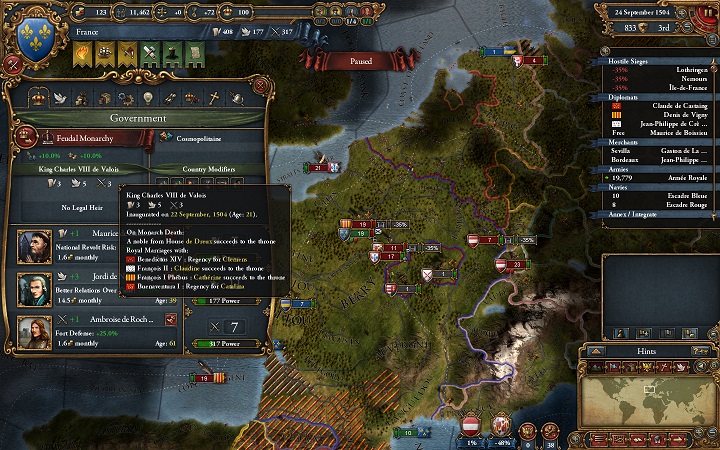 さらに4年ほど頑張ったのですが。 スイスとブルゴーニュにも宣戦されたところで心が折れました。 ギブアップ。 戦勝点120点分くらい条件積んでも講和してくれないスペインさん酷いです。