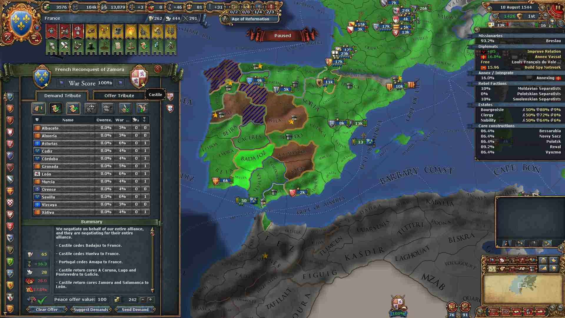 異端の改革中心地を全て潰すことが出来たので、帝国諸侯に対して戦争を行う必要が無くなりました。