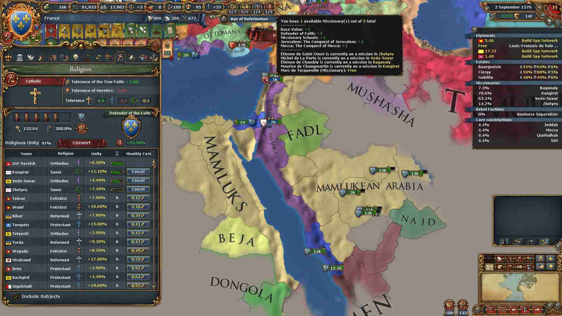 マムルークからメッカを奪いカソリックでの宣教師がMAXの5名になりました。