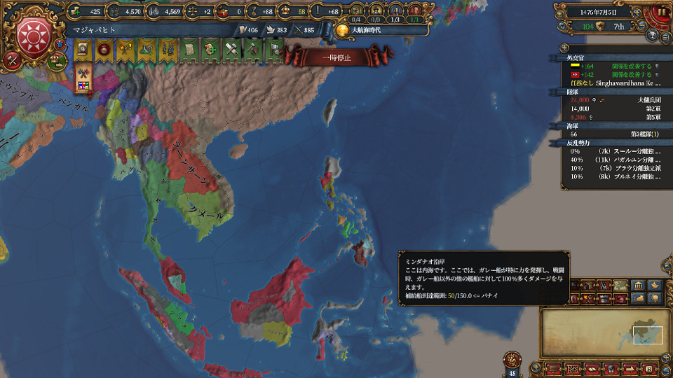 1444年12月にマジャパヒトの国難発生、選択肢を押すと安定度が-3になります。クリックせずに放置するならNOCBを2発撃てます。