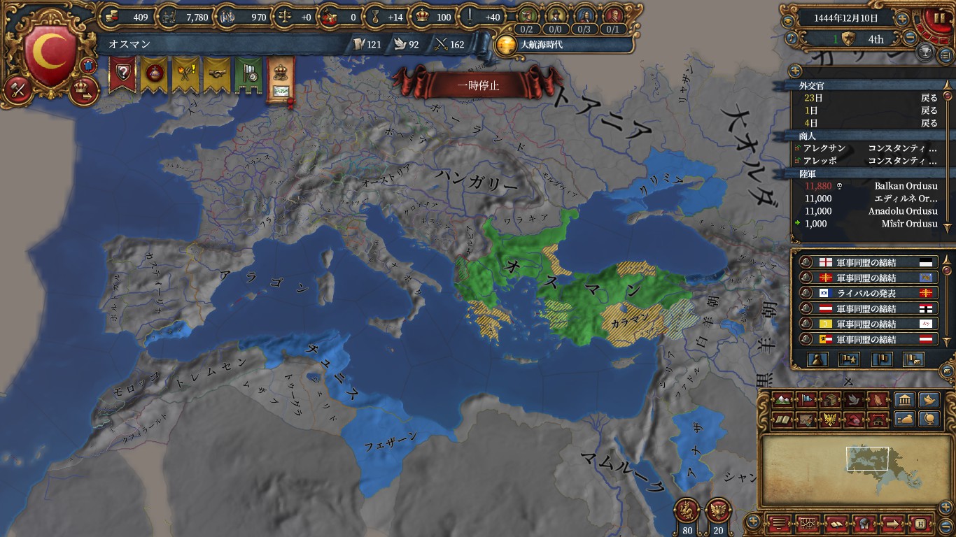 チュニス、クリミア、以下属国化用にアナザ、ドゥルカディル、フェザーン、ヒスンカイファ、グラナダ(トレムセン戦とカスティーリャ戦のAE減)、トレビゾンドと同盟。