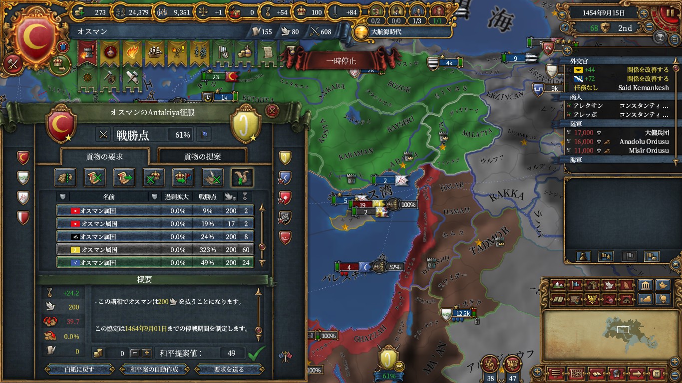 ミッション「マムルークの打倒」のためにマムルークからシリアやパレスチナの5州を手に入れる必要がありますが、属国移譲にすることで戦勝点コストを低くし、次回までの停戦期間を短くしています。