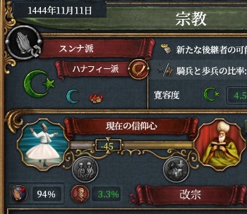 オスマン固有tier4「Sufism Decree」改革で利用できる修道会「Mevlevi」の州開発コストが-10%から-5%にナーフ