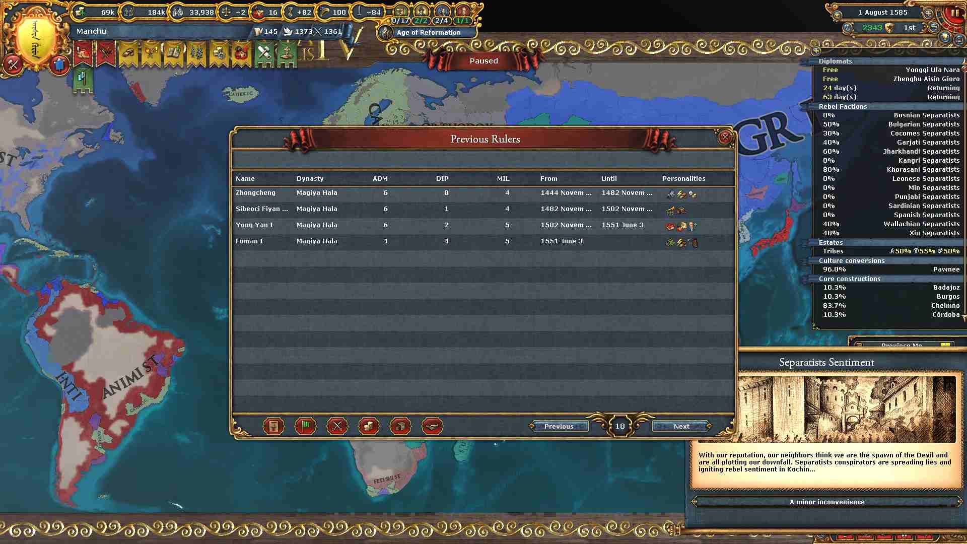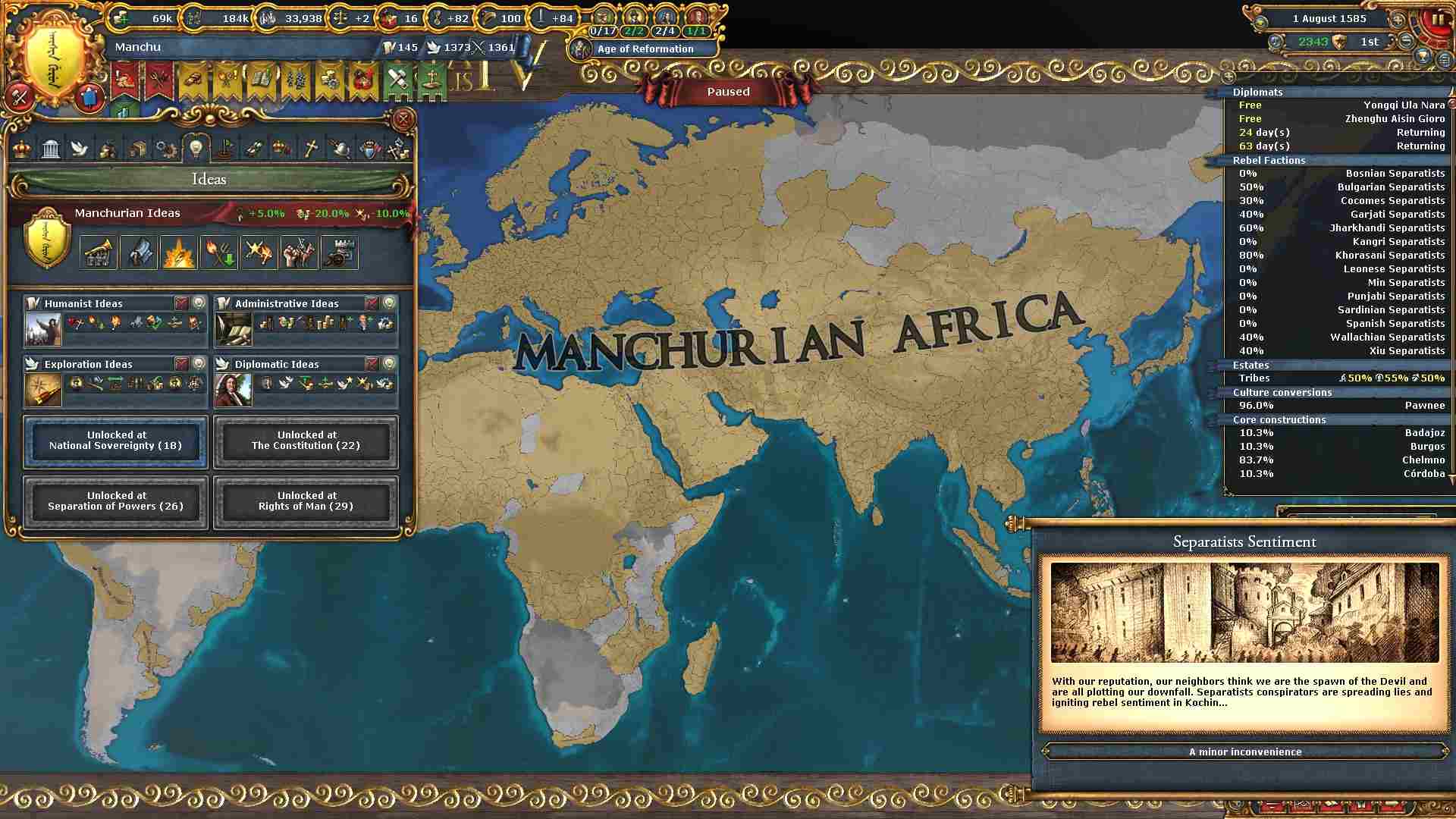 通常のプレイではコア化費用を減らす為に統治アイデアや絶対主義を上げることにより対処します。