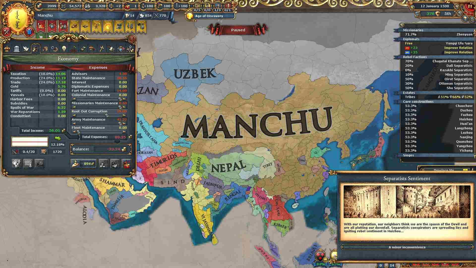 反乱軍がポコポコ生まれますが自治度上げや鎮圧部隊で乗り切ります。