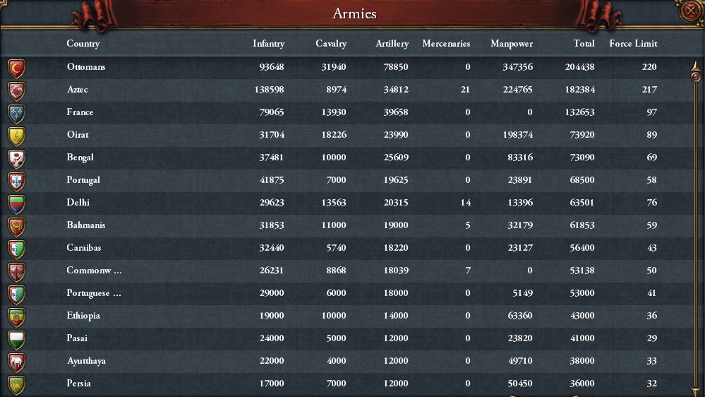 ・ここまではオーストリア・アステカ・オスマンで陸軍トップを争ってきましたが