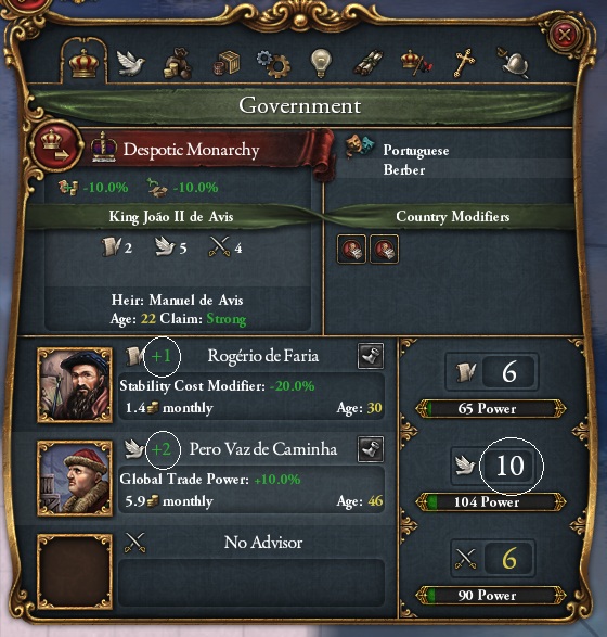 アドバイザーは金の問題で統治と外交のみを雇った。EU4ではアドバイザーは統治と外交と軍事の3スロットに分けられている。また白いまるで囲った数値は君主の力にプラスされる値である。基礎の3と君主能力とアドバイザーで君主の力が決まる。この君主の力が統治点や軍事点として溜まり、点を消費して技術開発をしたり、政策をとったりするわけである。