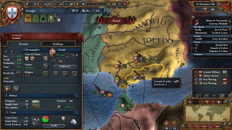1492年シナリオではこんな感じで既にアフリカ沿岸に領土を持っている。